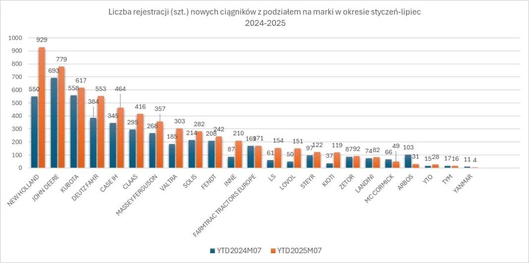 W lipcu zarejestrowano najwięcej ciągników marki John Deere – 182 sztuki, co stanowi wzrost o 54 sztuki wobec poprzedniego miesiąca. Tym samym John Deere zmniejszył stratę do New Hollanda po 7 miesiącach do 150 sztuk. Spory spadek względem czerwca zaliczył Deutz-Fahr – o 49 sztuk do 71 ciągników. A jak wygląda pełna klasyfikacja od początku roku?