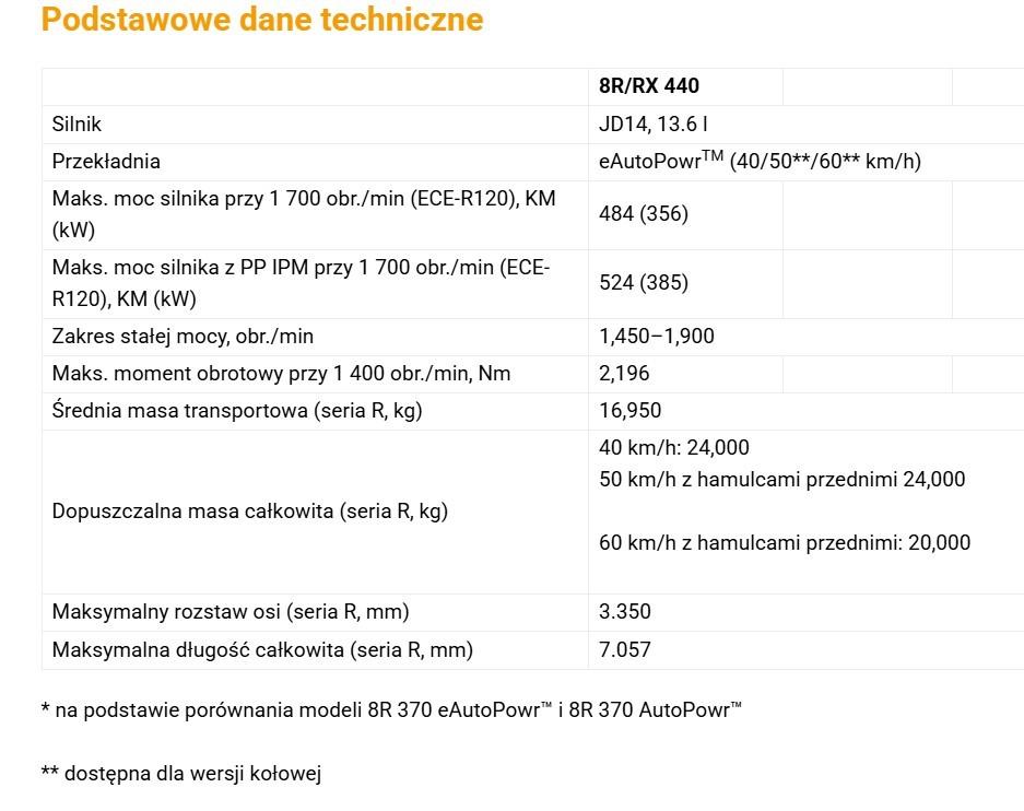 Nowe 8R/8RX oferują do 418 l/min wydatku hydrauliki. Tylny podnośnik (kat. 5) osiąga do 10,8 t udźwigu przy 610 mm, przedni do 4,8 t. Przedni WOM ma moc do 130 kW, a tylny (typ 4) oferuje prędkości 1000, 1000E i 1300 obr./min oraz do 548 KM mocy maksymalnej w pracy stacjonarnej. Opcjonalny hamulec silnikowy Jake Brake zapewnia do 300 kW mocy hamowania.