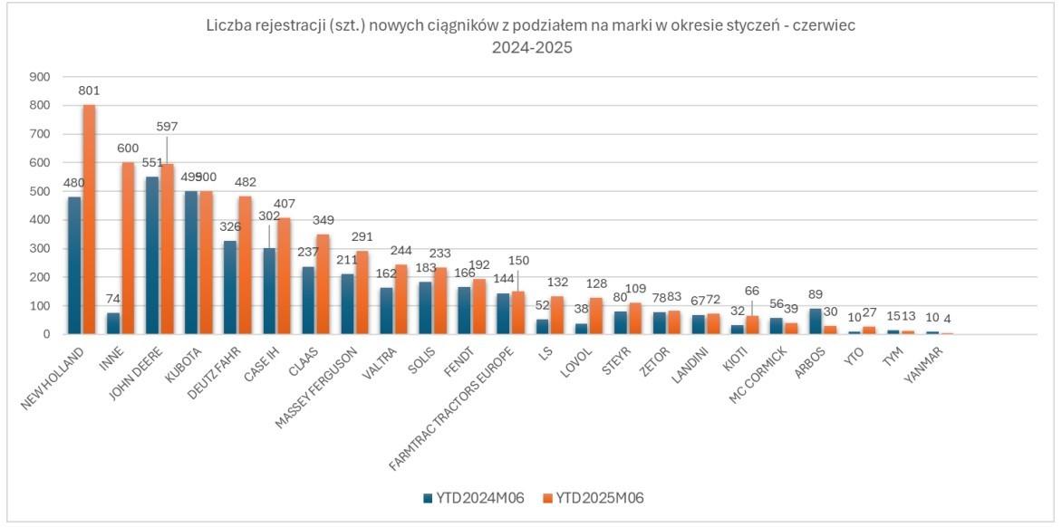 I to właśnie New Holland jest liderem jeśli chodzi o rejestracje ciągników w Polsce w pierwszym półroczu 2025 roku z liczbą 801 wobec 480 w tym samym okresie ubiegłego roku. Bez wątpienia do tego wyniku przyczyniła się dobra sprzedaż ciągnika T5.90 S; tylko w czerwcu zarejestrowano 28 sztuk tego modelu. Jednocześnie “Niebiescy” wyprzedzają o 204 sprzedane ciągniki drugiego John Deere’a, którego wyższość musieli uznać w całym 2024 roku.