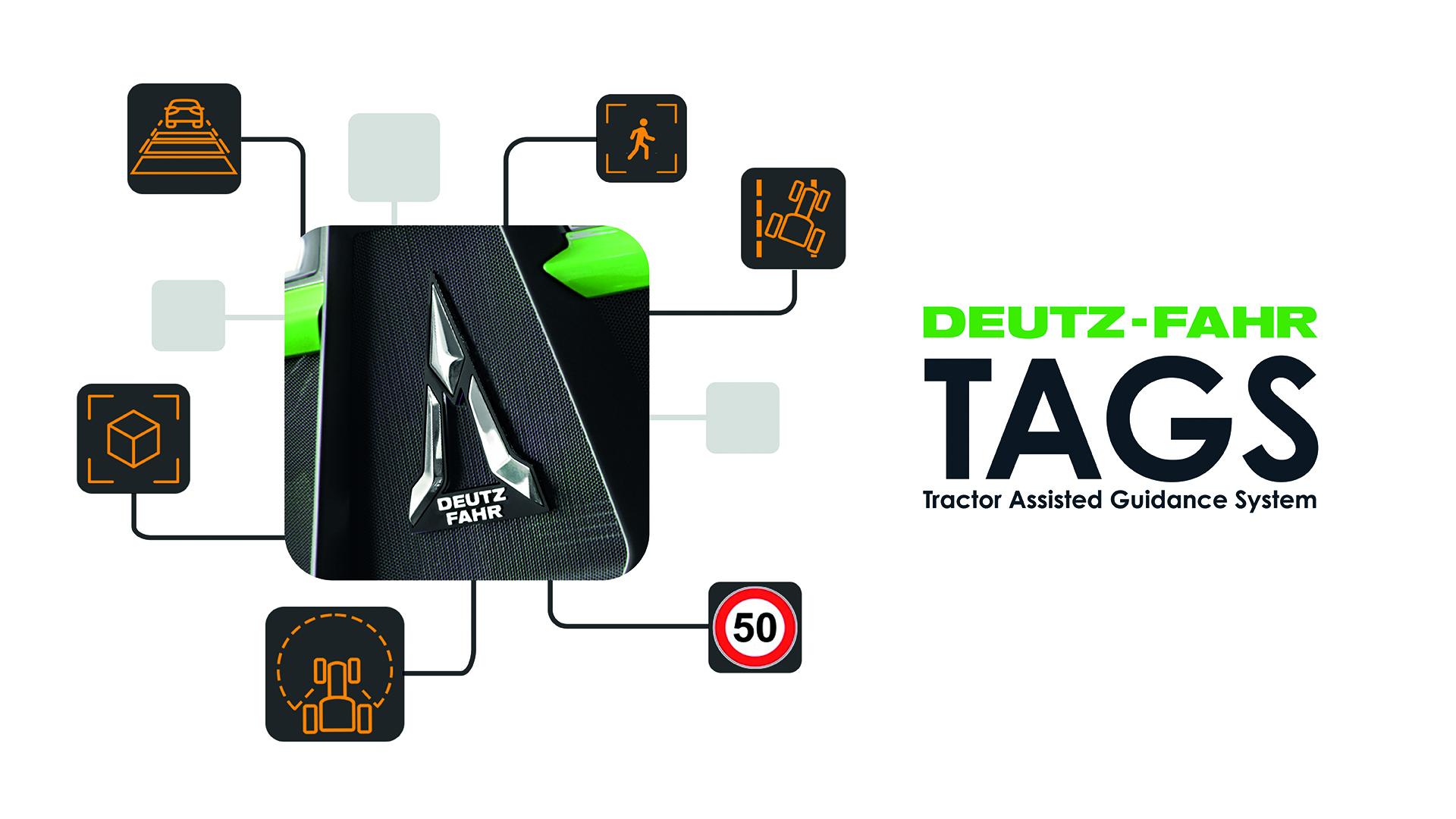 DEUTZ-FAHR TAGS – Tractor Assisted Guidance System to tak naprawdę zaawansowane rozwiązania wspomagania operatora ciągnika. Standardowy pakiet obejmuje funkcje "asystenta utrzymania pasa ruchu", "asystenta pokonywania zakrętów" oraz "rozpoznawania obiektów/osób", znane z samochodów osobowych i ciężarowych. Dzięki dodatkowemu pakietowi "Advanced" można je rozszerzyć o adaptacyjny tempomat z ostrzeganiem o kolizji i rozpoznawaniem znaków drogowych. Funkcje te uwzględniają rodzaj i wielkość narzędzi montowanych na ciągniku, jazdę po bocznych drogach bez oznakowania lub jazdę tuż za kombajnami do zbioru pasz podczas pracy na polach kukurydzy. Funkcje ADAS (Advanced Driver Assistance Systems), oparte są na całkowicie nowej architekturze elektronicznej, a także różnych systemach czujników i kamer. Rozwiązanie TAGS ma zadanie poprawę bezpieczeństwa jazdy po drogach i manewrowania w gospodarstwie. DEUTZ-FAHR informuje, że jest to początek rozwoju technologii dla wdrożenia w przyszłości szerokich funkcji autonomicznych. TAGS wykorzystywany w ciągnikach jest jednak systemem bardziej zaawansowanym niż te wykorzystywane w samochodach. Te ostatnie poruszają się po drogach i gładkiej nawierzchni najczęściej ze stałą prędkością jazdy bez większych przeszkód ze strony zabudowań. TAGS został tak opracowany, aby uwzględniać wszelkie zróżnicowania związane z wykonywaniem prac zarówno na polu, jak i w gospodarstwie.
