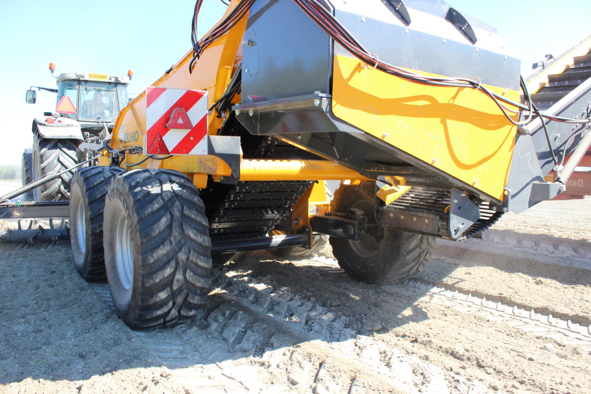 Dyszel teleskopowy z zabezpieczeniem przeciążeniowym automatycznie podnosi maszynę w razie kolizji z przeszkodą i samoczynnie ją opuszcza. Duże koła podporowe (26x12) i tandemowe (560/60 R22.5) gwarantują płynność jazdy nawet w najtrudniejszych warunkach.