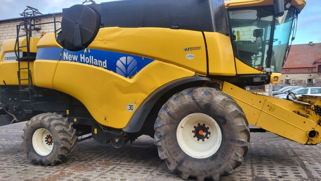 Wspomniane kombajny New Hollanda to modele CX 8080. Jeden z nich wyprodukowano w 2009, drugi w 2005 roku. Pierwszy wg opisu rzeczoznawcy jest sprawny, w stanie zadowalającym, lecz z dużym zużyciem podzespołów jak na wiek. Widoczne są ogniska korozji i wycieki hydrauliki, a kabina jest w stanie średnim. W komplecie znajduje się heder z przystawką do rzepaku; ogumienie ok. 60%. Serwis maszyny prowadzony był na bieżąco. Jego przeg to 6218 mth, a minimalna cena netto wynosi 140 tys. zł (172 200 zł brutto).