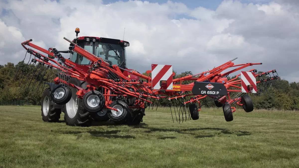 KUHN promuje także dwie zgrabiarki. Pierwsza to dwukaruzelowa GA 6501 P o szerokości roboczej od 5,65 m do 6,40 m. Zawieszana maszyna wyposażona jest w podwójnie gięte, stycznie montowane ramiona karuzel, które zapewniają wysoką jakość zgrabiania i formowanie szybko przesychających wałów pokosu. Do formowania jednorodnych, puszystych i równych wałów przyczynia się stroma prowadnica krzywki, dzięki której palce są unoszone szybciej, z większym opóźnieniem i potrzebują do tego mniejszej siły.