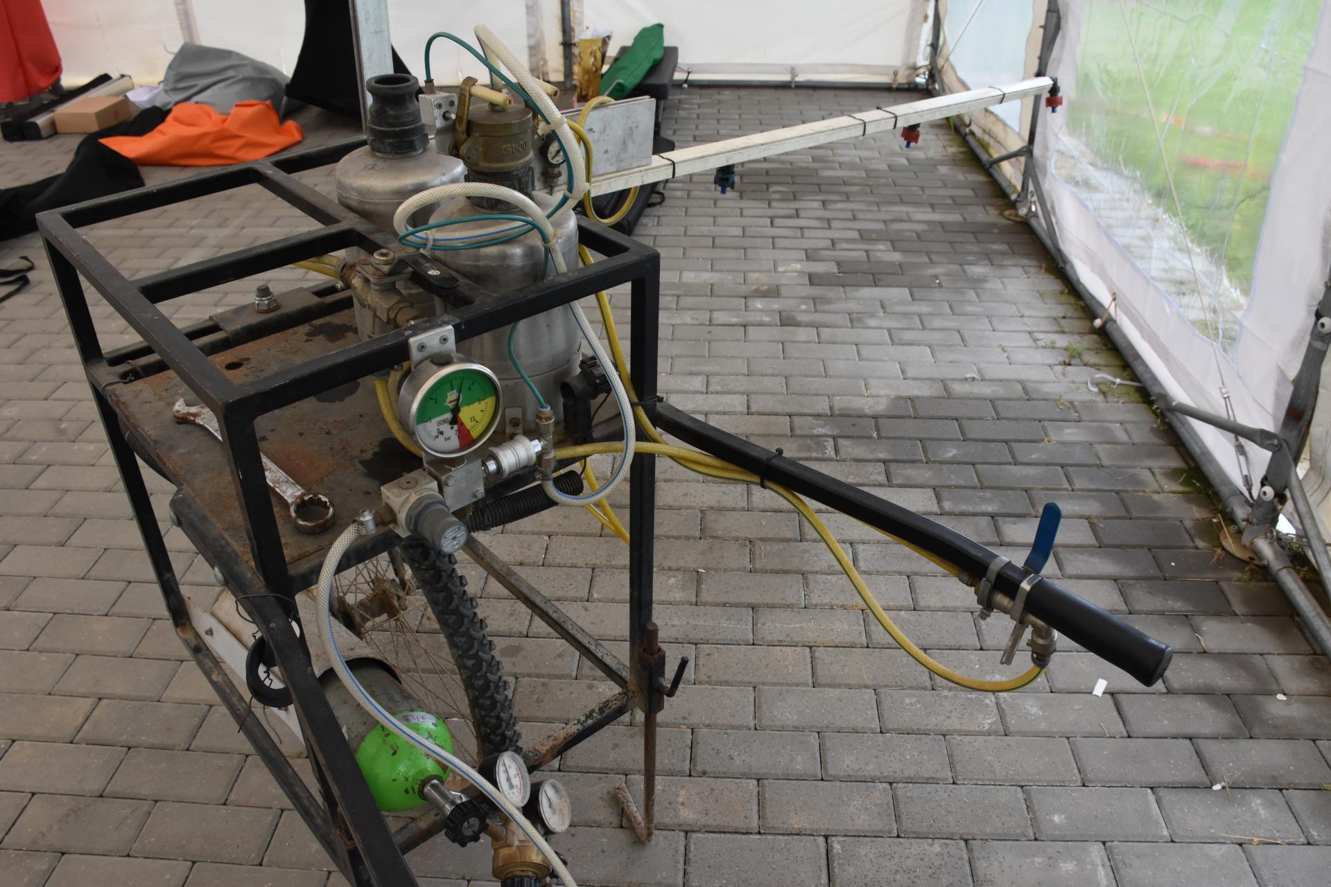– To jest opryskiwacz zbudowany na rowerowym kole. Stworzyliśmy go na specjalnej ramie, do której jest przymocowany zbiornik ze sprężonym powietrzem. Napędzamy go siłą mięśni, bo opryskiwacz dysponuje dwoma rączkami, dzięki którym można go pchać po polu. Do zbiorników podajemy odpowiednią ilość cieczy użytkowej. Jest to od razu gotowa ciecz robocza przygotowana wcześniej w laboratorium. Są dwie komory, do których ciecz jest wlewana. Do układu wprowadzane jest sprężone powietrze. Mamy informację o ciśnieniu, ponieważ opryskiwacz posiada manometr – tłumaczy Waldemar Orzechowski.