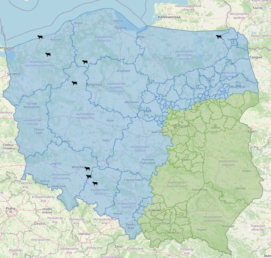 Od początku 2026 r. w Polsce potwierdzono już 8. ognisk choroby niebieskiego języka (BTV). W drugiej połowie lutego opisaliśmy przypadek choroby w dużym stadzie bydła w województwie opolskim. Teraz Główny Inspektorat Weterynarii (GIW) zaktualizował mapę ognisk i poinformował o dwóch kolejnych przypadkach – ogniska choroby niebieskiego języka nr. 7/2026 oraz 8/2026. Oznacza to, że wirus pojawił się w dwóch nowych powiatach kraju: oleckim i pilskim.