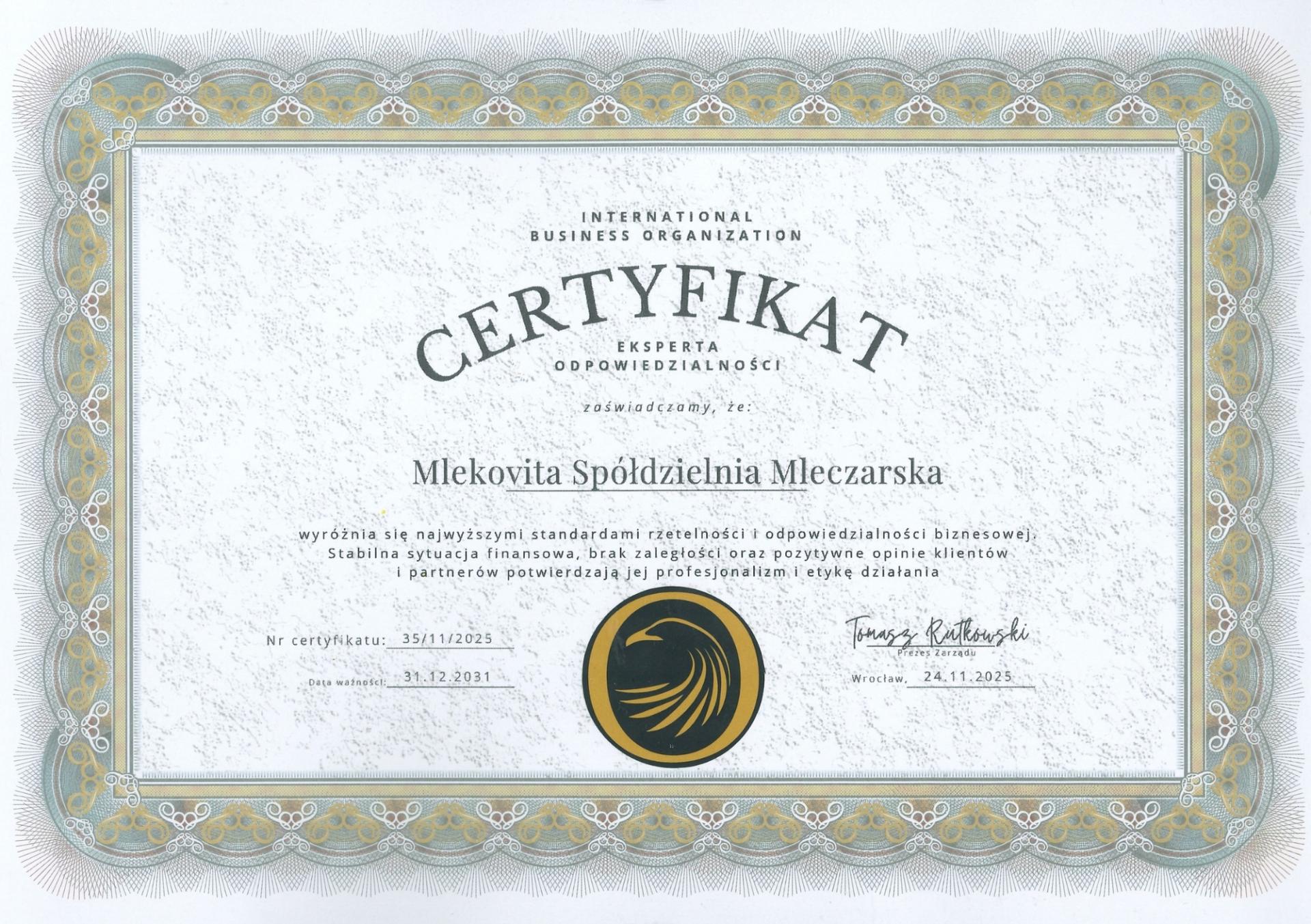 To już druga w ostatnim czasie nagroda dla Mlekovity w zakresie odpowiedzialności biznesowej. International Business Organization przyznała firmie Certyfikat Eksperta Odpowiedzialności za najwyższe standardy rzetelności i odpowiedzialności biznesowej, potwierdzając profesjonalizm firmy i jej etykę działania poświadczone pozytywnymi opiniami klientów i partnerów.