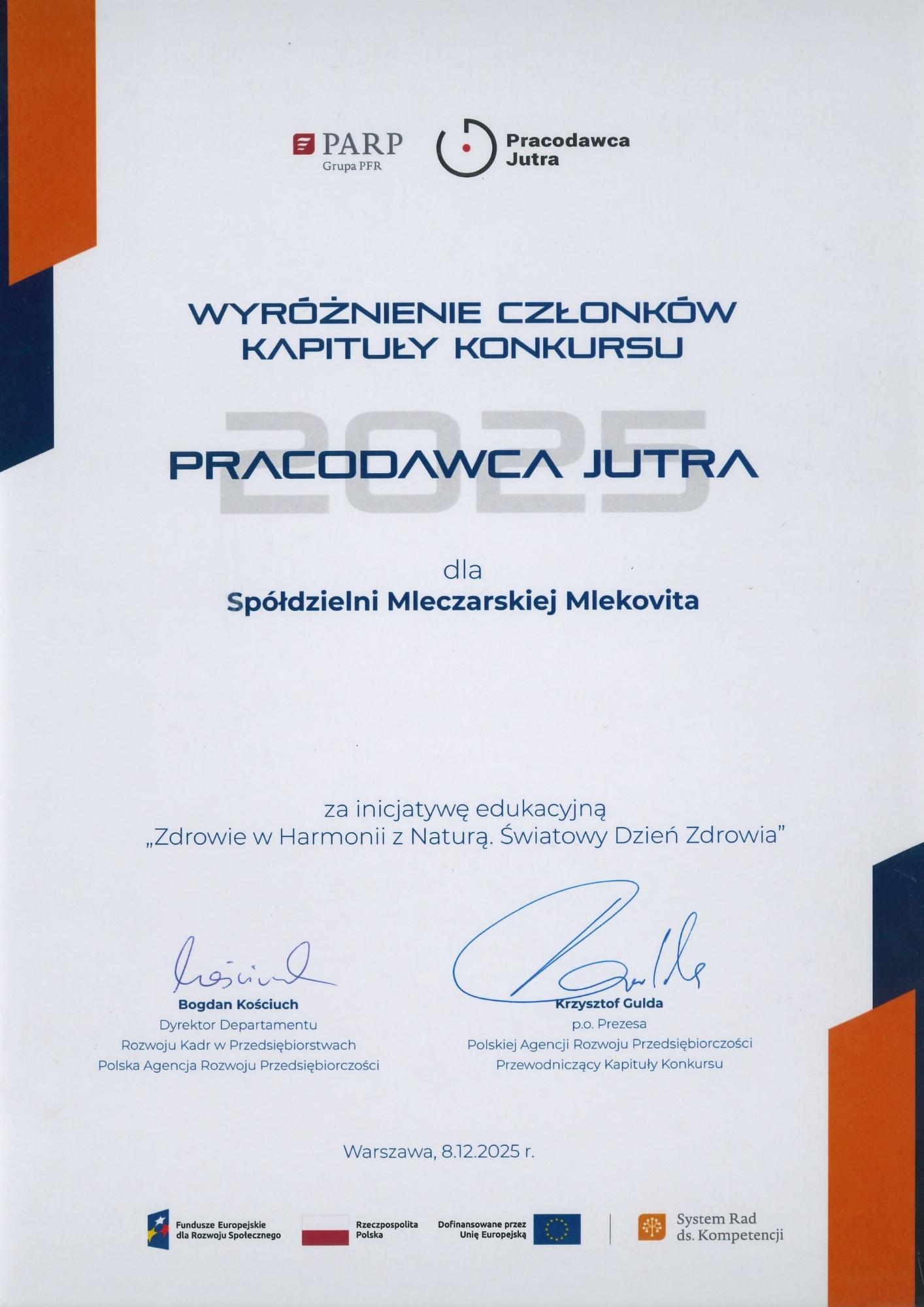 "Pracodawca Jutra" to inicjatywa Polskiej Agencji Rozwoju Przedsiębiorczości (PARP), wyróżniająca przedsiębiorców oraz instytucje edukacyjne, które w modelowy sposób łączą biznes z edukacją i wyznaczają standardy odpowiedzialnego rozwoju kompetencji. Wyróżnienie przyznane Mlekovicie stanowi potwierdzenie, że odpowiedzialność, troska o zdrowie oraz realna współpraca mogą skutecznie łączyć się z nowoczesnym i odpowiedzialnym biznesem.