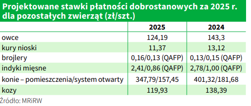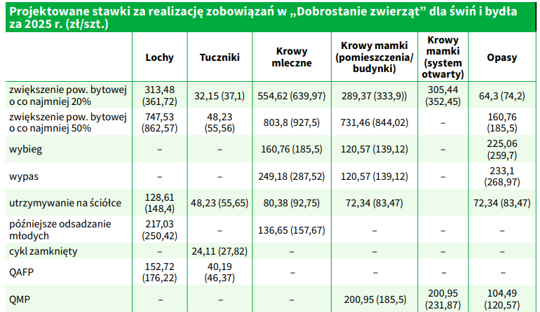 Ministerstwo rolnictwa opublikowało 7 kwietnia projekt rozporządzenia w sprawie stawek płatności w ramach ekoschematu „Dobrostan zwierząt” za 2025 r. Niestety, podobnie jak w ubiegłym roku, ze względu na kurs wymiany euro użyty do przeliczenia stawek, tj. 4,2698 zł (w ubiegłym roku było to 4,2788 zł) oraz zainteresowanie płatnościami są one niższe od ubiegłorocznych. Stało się tak pomimo tego, że kwota zarezerwowana na te płatności jest wyższa i wynosi ponad 1,054 mld zł (w ubiegłym roku było to 998 zł). W przypadku bydła i świń projektowana stawka płatności za jeden punkt wynosi 80,38 zł i jest o 12,37 zł niższa niż za 2024 r.