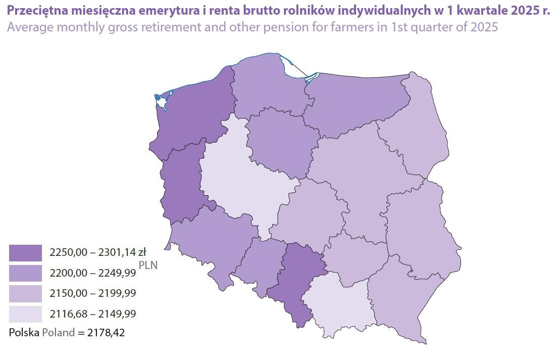Według raportu gusowskiego w pierwszym kwartale 2025 roku przeciętna emerytura rolnika wyniosła 2 178,42 zł brutto.