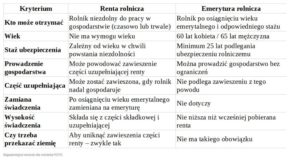 W przeciwieństwie do renty, przy emeryturze rolniczej nie ma obowiązku zaprzestania działalności rolniczej. Oznacza to, że po przejściu na emeryturę można nadal prowadzić gospodarstwo i jednocześnie pobierać świadczenie w pełnej wysokości.
