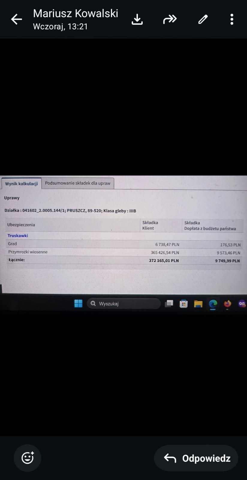 – To była działka 1,5 ha o wartości, która została zaniżona, na prośbę PZU do 75 tys. zł. Za ubezpieczenie od gradu i wiosennych przymrozków miałbym do zapłaty składkę klienta w wysokości 372 165,01 zł, a wartość składki z budżetu państwa miałaby wynosić 9 749,99 zł. Myślałem, że się z przecinkami pomylili – mówi.