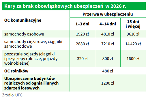 Najniższe kary są za brak polisy OC za ciągnik lub przyczepę rolniczą. Mając jednak na uwadze, że w gospodarstwie zwykle jest więcej takich pojazdów, przeoczenie opłaty OC może wiązać się także z wysokimi kosztami. Przerwa w ubezpieczeniu OC takich pojazdów do 3 dni łączy się z karą na poziomie 320 zł, a powyżej 14 dni – 1600 zł za każdy pojazd.