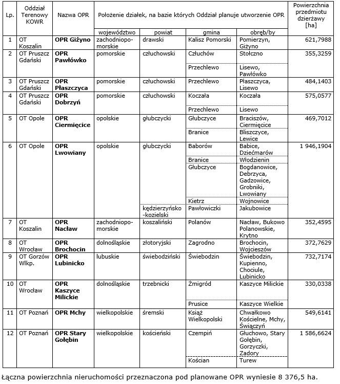 KOWR poinformował nasza redakcję, że minister rolnictwa wydał już zgodę na utworzenie dziesięciu OPR-ów, ale nie został jeszcze wyłoniony dzierżawca nieruchomości. Chodzi o: