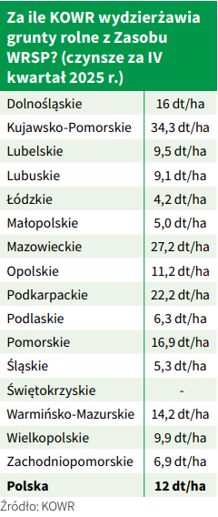 Z danych opublikowanych przez KOWR wynika, że najwyższe czynsze w 2025 r. uzyskano w województwie łódzkim (35,9 dt/ha), następnie w województwach kujawsko-pomorskim (24,4 dt/ha), podkarpackim (19,2 dt/ha) i w pomorskim (18,8 dt/ha).