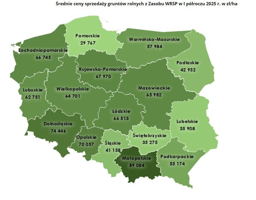Ceny gruntów rolnych mocno różnią się w zależności od województwa. W Małopolsce, Dolnym Śląsku i Opolskiem hektar kosztuje średnio od 70 do nawet 90 tys. zł. W Wielkopolsce, na Mazowszu czy w Zachodniopomorskiem ceny oscylują wokół 65-67 tys. zł. W Lubuskiem i na Warmii i Mazurach hektar ziemi to wydatek rzędu 58-63 tys. zł. Najtańsze są grunty w północnej Polsce - w woj. kujawsko-pomorskim i pomorskim średnia cena wynosi niespełna 30 tys. zł za ha. W Podlaskiem trzeba zapłacić ok. 43 tys. zł, a w Podkarpaciu nieco ponad 53 tys. zł.