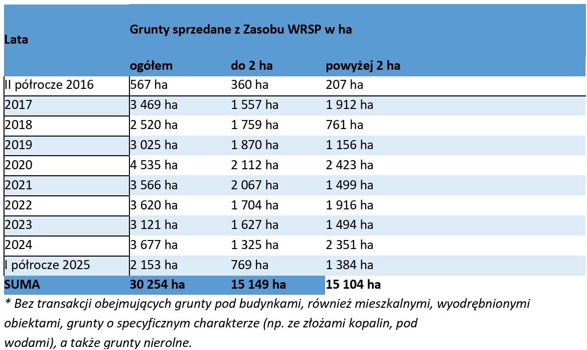 Negatywne rozstrzygnięcia w odniesieniu do nieruchomości z tego przedziału powierzchni dotyczyły 8 wniosków, co stanowi 1,36% liczby wszystkich wniosków. W okresie od II półrocza 2016 r. do I półrocza 2025 r. sprzedano z ZWRSP łącznie prawie 30 254 ha gruntów rolnych, z czego: 15 149 ha stanowiły działki do 2 ha, a kolejne 15 104 ha stanowiły działki powyżej 2 ha.