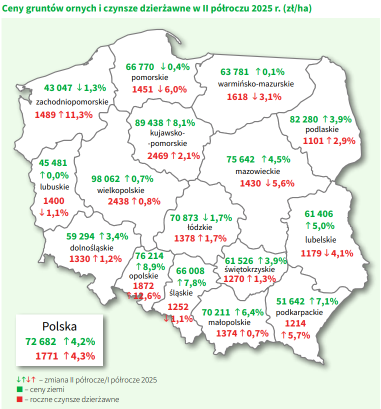 W ciągu ubiegłego roku średnia cena hektara gruntu ornego w Polsce wzrosła do 73 tys. zł, a średni czynsz zbliża się do 1800 zł/ha – podaje GUS. W obu przypadkach wartości zmieniły się o ponad 4%. Ponad 98 tys. zł trzeba wyłożyć, aby kupić ziemię rolną na rynku międzysąsiedzkim w Wielkopolsce. Dzierżawa hektara kosztuje ponad 2400 zł rocznie. Podobny czynsz jest w województwie kujawsko-pomorskim, a ziemia kosztuje tam ponad 89 tys. zł.