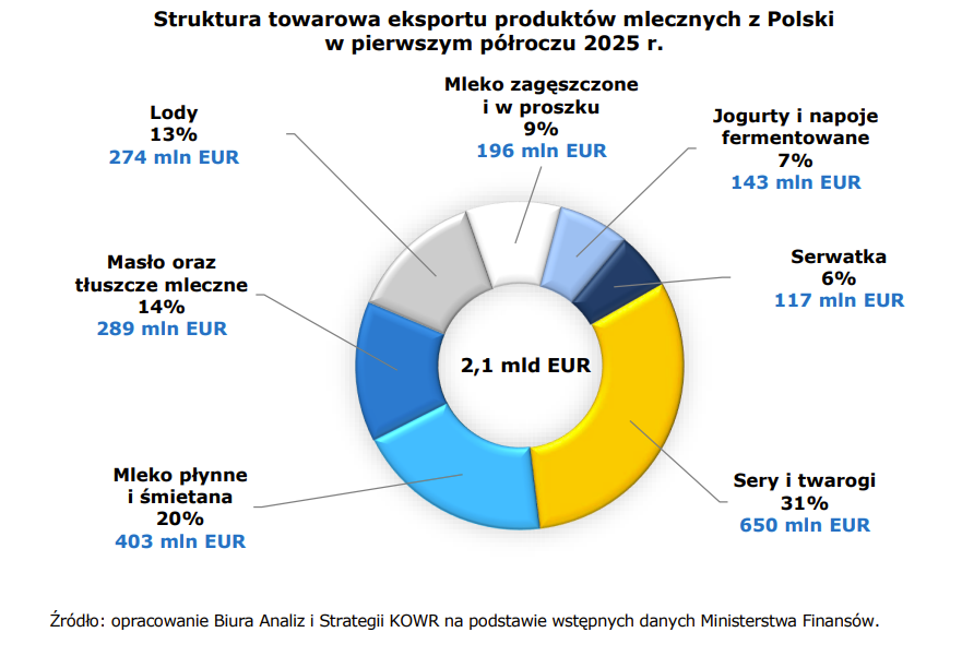 Z analizy ekspertów KOWR wynika, że udział krajów spoza UE w eksporcie produktów mlecznych z Polski wyniósł 27%. Kwota przychodów uzyskana z eksportu na rynki spoza UE w pierwszym półroczu 2025 r. była wyższa o 1% w stosunku do poprzedniego roku i wyniosła 560 mln EUR.