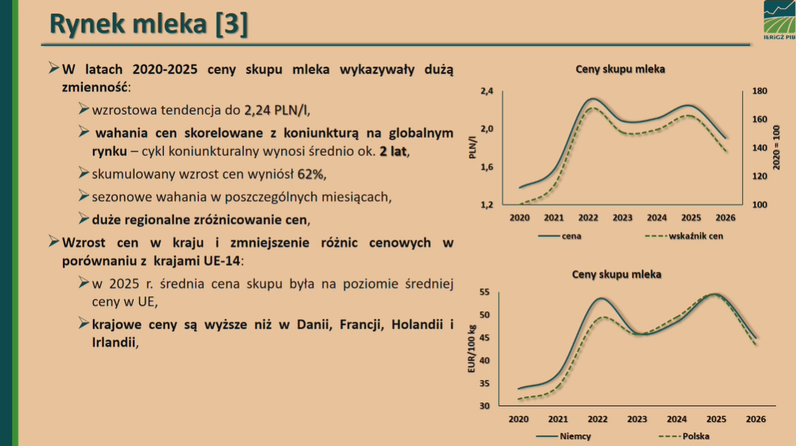 Dyrektor Wigier wyjaśnił również skąd wynika spadek cen skupu mleka. Jak przyznał, na przestrzeni analizowanych 5 lat (2020-2025) ceny mleka zmieniały się sięgając nawet 2,40 zł/l, jednak było to silnie skorelowane z koniunkturą na rynku globalnym.