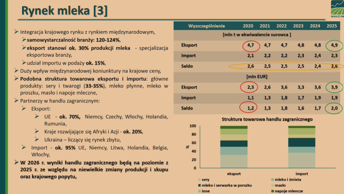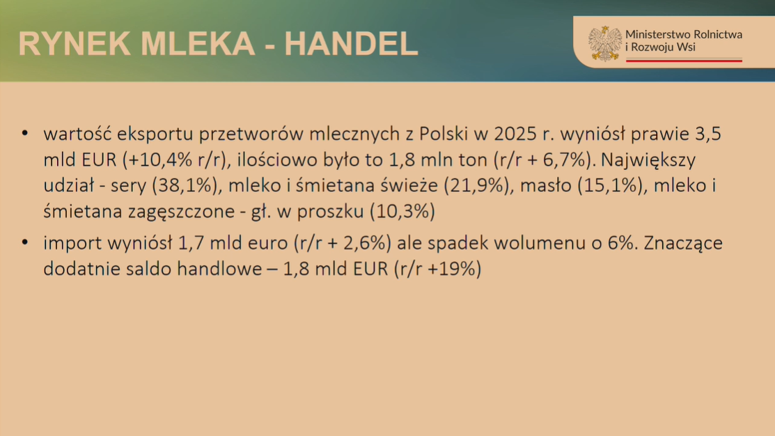 Pozytywnie oceniono również tendencje obserwowane w handlu zagranicznym, a to wszystko za sprawą eksportu przetworów mlecznych w roku 2025, którego wartość wyniosła 3,5 mld euro, czyli o ponad 10% więcej w stosunku do analogicznego okresu roku 2024.