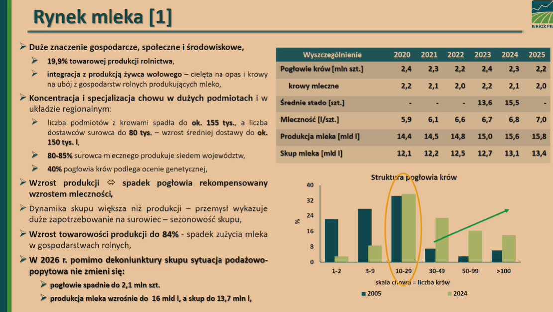 Kolejną prezentację na temat rynku mleka przedstawił Dyrektor Instytutu Ekonomiki Rolnictwa i Gospodarki Żywnościowej Polskiego Instytutu Badawczego Marek Wigier, który wprost stwierdził, że rynek mleka jest jednym z kluczowych segmentów rolnictwa o dużym znaczeniu gospodarczym, społecznym oraz środowiskowym, odpowiadający za blisko 20% produkcji towarowej rolnictwa i pozostający w ścisłym związku z rynkiem żywca.