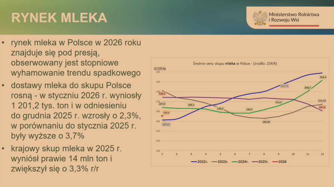Dyrektor Departamentu Rynków Rolnych Katarzyna Gołębiowska za pośrednictwem prezentacji multimedialnej przedstawiła analizę danych dotyczącą zachowań na rynku mleka. Jak stwierdziła, w roku 2026 znajduje się on pod wyraźną presją, ale trend spadkowy cen skupu mleka stopniowo wyhamowuje.
