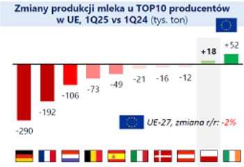Analiza sytuacji popytowo-podażowej 10 największych producentów mleka w UE w stosunku rok do roku przygotowana przez analityków Banku Pekao wykazała, że Polska i Irlandia jako jedyne mogą pochwalić się wzrostem produkcji. W przypadku Polski było to 18 tys. t, a w przypadku Irlandii 52 tys. t.