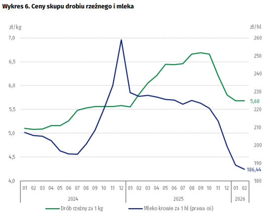 Jak wynika z danych opublikowanych przez Główny Urząd Statystyczny, w lutym 2026 r. średnia cena skupu mleka spadła o 1,3% w stosunku do stycznia br. i wyniosła 1,86 zł/l, jednocześnie była to kwota niższa od odnotowanej w analogicznym okresie minionego roku o 18%.