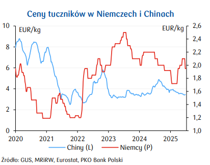 Z danych udostępnionych przez Bank PKO wynika, że w pierwszych miesiącach roku lekkie odbicie zanotował unijny eksport wieprzowiny, który wzrósł o 1,9% rok do roku dzięki większemu popytowi w Azji, zwłaszcza w Chinach, gdzie wysyłki zwiększyły się o 6,4%. Również Tajwan i Malezja odnotowały wzrost importu z UE, mimo że sprzedaż do Japonii spadła. Chiny, mimo że nadal kupują mniej niż w latach wcześniejszych, pozostają kluczowym rynkiem zbytu. Osłabienie amerykańskiego eksportu do Chin, mogło dodatkowo wspierać popyt na unijną wieprzowinę. Eksport rósł mimo utrudnień związanych z wystąpieniem pryszczycy w części krajów UE, co ograniczyło handel m.in. z Wielką Brytanią. Jednocześnie większa produkcja niż eksport w okresie styczeń–kwiecień zwiększyła presję na krajowe rynki i sprzyjała spadkom cen.