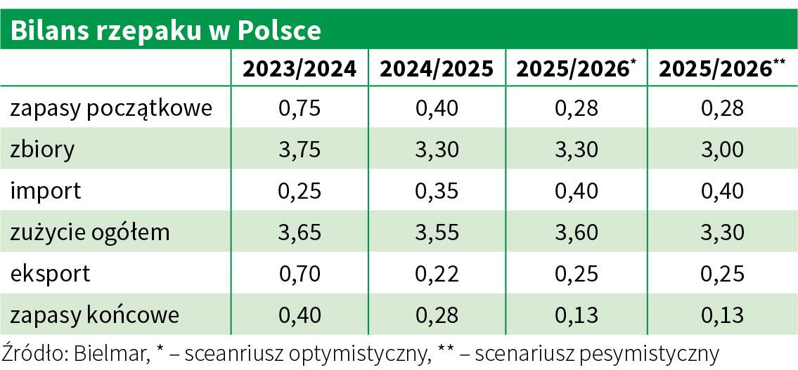 Według oceny Arkadiusza Gasidły, w ten sezon Polska wejdzie z zapasami rzepaku na poziomie 280 tys. t. Przy zbiorach na poziomie 3,3 mln t i przerobie na poziomie 3,6 mln t albo w przypadku spadku zbiorów do 3 mln t i przerobu do 3,3 mln t oraz przy eksporcie w wysokości 250 tys. t dla utrzymania zdolności produkcyjnych deficyt nasion rzepaku w Polsce wyniesie 300–400 tys. t albo 600–700 tys. t. W obu scenariuszach dotyczących wielkości produkcji i przerobu zeszlibyśmy do zapasów końcowych na poziomie zaledwie 130 tys. t.