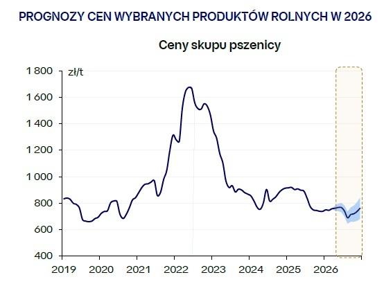 PKO BP prognozuje, że w drugiej połowie 2026 roku roczna dynamika cen skupu pszenicy według GUS może wynieść od -13 proc. do +3 proc. To oznacza, że ceny mogą nadal pozostawać pod presją, choć spadki powinny być mniejsze niż w pierwszej połowie roku.