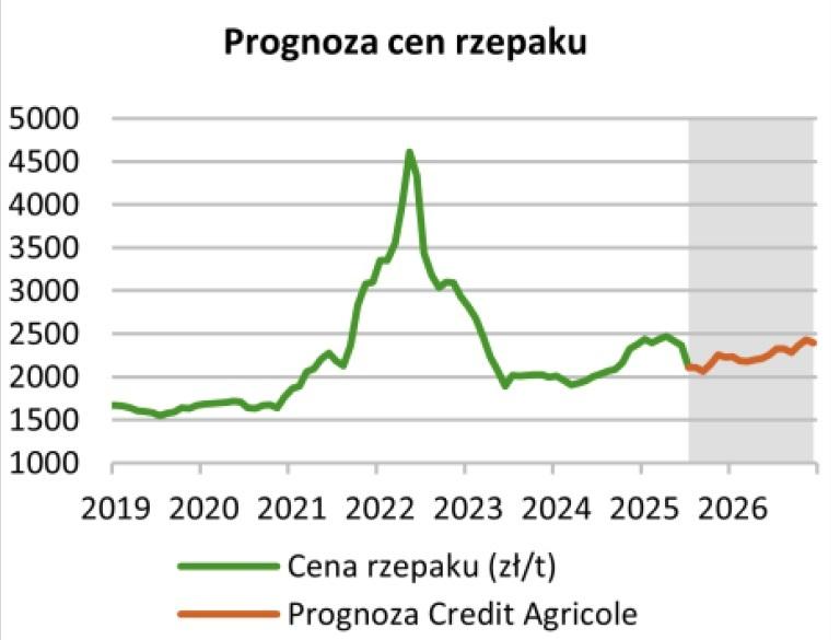 Eksperci Credit Agricole prognozują, że na koniec 2025 roku cena rzepaku osiągnie około 2200 zł za tonę. A na koniec 2026 roku wzrośnie do około 2400 zł za tonę.
