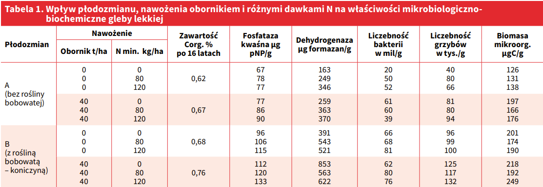 Natomiast w takim samym obiekcie (gleba nienawożona) w zmianowaniu B (z rośliną bobowatą), bogatszym w resztki roślinne z traw i przyoraną jako międzyplon zieloną masą gorczycy, zarówno populacje drobnoustrojów, jak i ich aktywność (enzymy) były znacznie wyższe. Wyniki te potwierdzają jak ważne dla mikroorganizmów glebowych, a także dla innych organizmów żyjących w glebach, są zarówno ilość, jak i jakość resztek roślinnych. Wyniki prezentowane w tabeli 1 potwierdziły prawidłowość, że im więcej próchnicy w glebie, tym więcej mikroorganizmów. Największe liczebności oraz biomasa bakterii i grzybów, a zwłaszcza enzymów z grupy dehydrogenaz i fosfataz stwierdzano na ogół w glebie nawożonej obornikiem i azotem mineralnym w zmianowaniu B. Warto też zwrócić uwagę na fakt, że nawet największa dawka N mineralnego stosowana w tzw. gorszym pod względem doboru gatunku roślin zmianowaniu A, nie spowodowała spadku wartości badanych parametrów aktywności mikrobiologicznej gleby poniżej wartości tych wskaźników stwierdzanych w glebie nienawożonej.