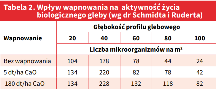 Wapń regulując odczyn gleby odgrywa kluczową rolę w tworzeniu próchnicy. W wyniku odkwaszenia gleby poprawia się odżywianie mineralne roślin, kondycja i zdrowotność roślin, a w konsekwencji rosną plony i poprawia się ich jakość. Poprawia się także struktura i właściwości gleby. Gleby mają lepszą strukturę granulometryczną, większą pojemność wodną, większą sorpcję wymienną, są łatwiejsze w uprawie, mniej zlewne dzięki powstającym gruzełkom, zatrzymują więcej wody i stają się żyzne, a to przekłada się na większe plony i zdrowie roślin uprawnych. Systematyczne stosowanie małych, profilaktycznych dawek nawozów wapniowych lub wapniowo-magnezowych jest również najlepszym sposobem zwiększania ilości wapnia w glebie i utrzymania żyzności gleby. Wpływ wapnowania na aktywność życia biologicznego gleby przedstawiono w tabeli 2.