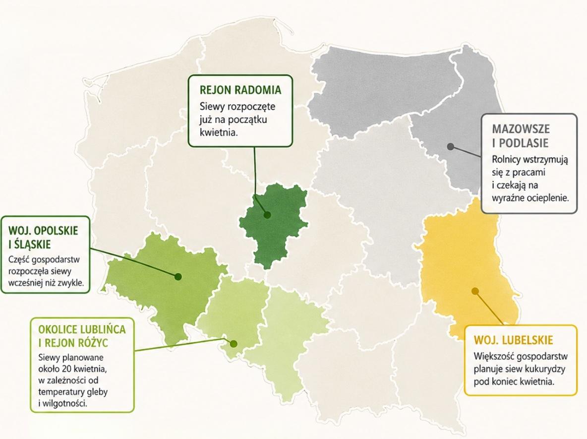 Już 15 kwietnia w województwo wielkopolskie rozpoczęto pierwsze prace polowe, a 18 kwietnia na Kujawach siew kukurydzy cukrowej ruszył pełną parą. 24 kwietnia kolejne gospodarstwa wchodziły w pole, m.in. w Chociwel, gmina Strzelin, Dolny Śląsk, gdzie wysiano kolekcję aż 24 odmian kukurydzy na kiszonkę. Rolnicy podkreślają, że choć warunki są miejscami suche, to na głębokości siewu (ok. 4–5 cm) wciąż dostępna jest wilgoć, co pozwala na kontynuację prac.