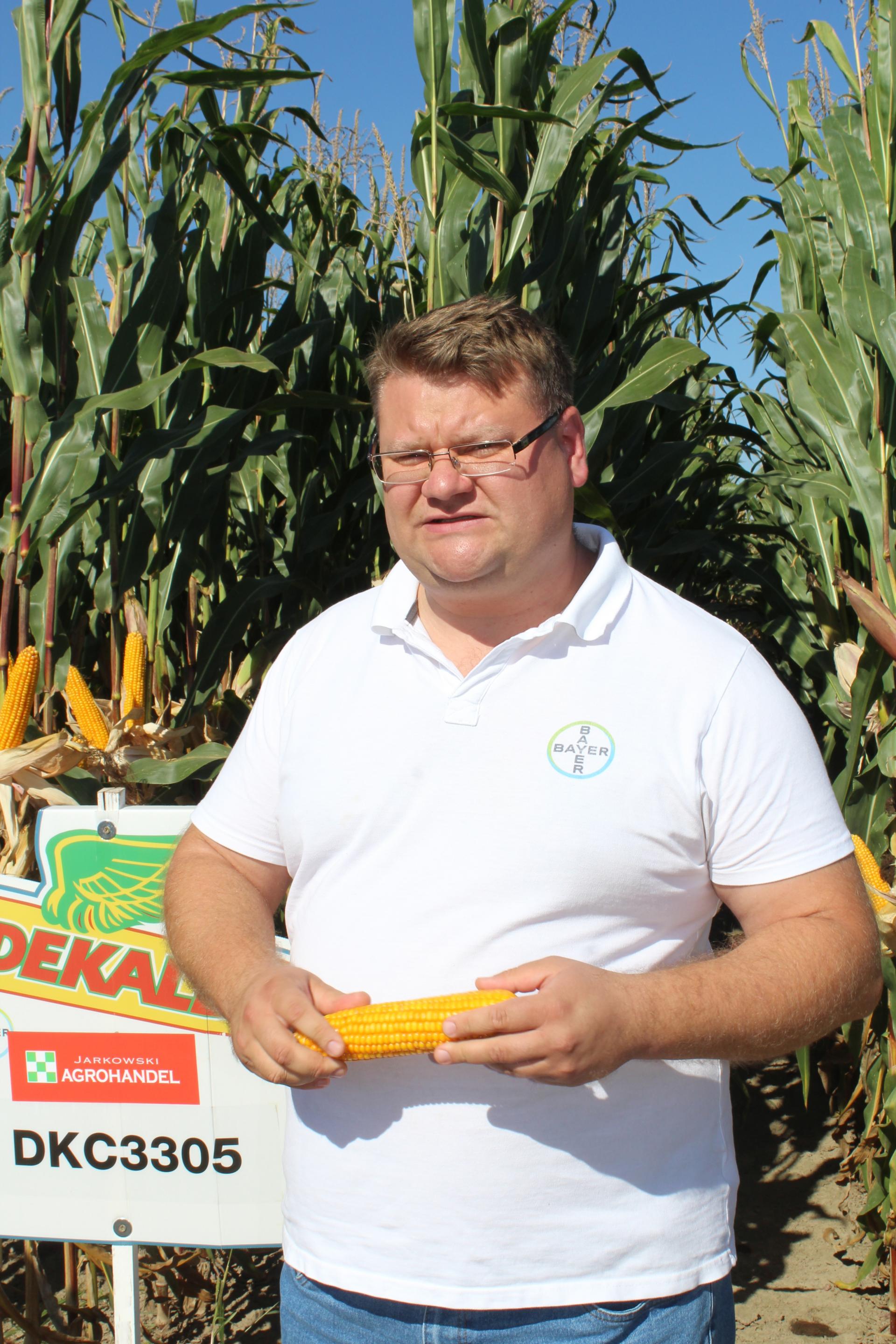 – Na początku chciałbym opowiedzieć o dwóch odmianach kiszonkowych. Pierwszą z nich jest DKC3305 o FAO 250, która swój plon buduje masą, którą tworzy jej wysokość, szeroka blaszka liściowa i oczywiście kolba. Jest to odmiana, którą rekomendujemy na nieco słabsze stanowiska glebowe, na których sobie dobrze radzi. Tutaj mamy glebę IV klasy bonitacyjnej i widzimy, że sobie fantastycznie w tych warunkach poradziła. Posiada ona ziarno typu flint/dent i właśnie taki typ ziarna rekomendujemy do żywienia zwierząt. Inną cechą tego typu ziarna jest z reguły bardzo dobry wigor początkowy. Rzeczywiście odmiana ta startuje na poletkach jako pierwsza i ma tolerancję na wiosenne chłody, co było bardzo przydatne w tym roku – powiedział Wojciech Pieczewski.