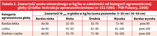 Otrzymaną wartość należy następnie przyporządkować do jednej z klas zasobności azotu mineralnego wg przedziałów zawartości azotu mineralnego w kg/ha w zależności od kategorii agronomicznej badanej gleby opracowanych w IUNG – PIB (tabela 2).