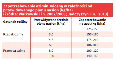 Jeśli wczesną wiosną nie był wykonywany test Nmin wówczas należy przyjąć, że wymagania pokarmowe roślin są takie same jak potrzeby nawozowe roślin. Należy ponadto uwzględnić wartość stanowiska. Na stanowiskach o niskiej zawartości próchnicy, dawkę azotu mineralnego zaleca się zwiększyć o 20% w stosunku do zakładanej. Przykładowe wiosenne zapotrzebowanie roślin ozimych na azot zamieszczono w tabeli.