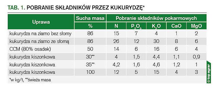 Najlepszym terminem na podanie potasu w kukurydzy jest jesień. Jeśli planujemy siać kukurydzę na cięższych stanowiskach, cały potas możemy podać już pod uprawę jesienną: bądź głęboką lub orkę. Jeśli natomiast chcemy zasiać kukurydzę na lżejszych stanowiskach, to w myśl ogólnej zasady „żeby nam potasu nie wymyło” możemy dawkę podzielić: 2/3 jesienią i 1/3 na przedwiośniu lub wiosną. A co, jeśli nie zdążyliśmy zastosować potasu już na jesień? Zawsze można to zrobić np. teraz, jeszcze zimą, kiedy warunki polowe pozwalają na wjazd z rozsiewaczem, nie grozi zmycie nawozu po zastosowaniu, na polach nie stagnuje woda, a gleba nie jest zamarznięta poniżej 30 cm. Właściwie każdy z tych warunków jest spełniony teraz, więc z nawozem potasowym (niezawierającym azotu) możemy już wjeżdżać. Pobranie potasu przez kukurydzę sprawdzisz w tabeli poniżej.