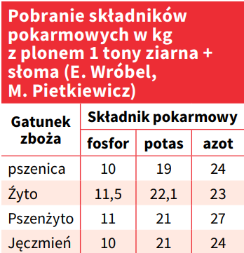 Na dobrych stanowiskach z uregulowanym odczynem pH gleby nawożenie przedsiewne pod zboża ozime powinno dotyczyć głównie fosforu i potasu. Optymalny system nawożenia zbóż tymi składnikami powinien opierać się na znajomości zasobności stanowiska w przyswajalne ich formy. W oparciu o te dane i ilości składników, które przy zakładanym plonie zostaną z nim wyniesione (tabela) można określić potrzeby nawozowe zbóż i ewentualny podział dawki potasu na porcję jesienną i korekcyjną wiosenną. Na glebach o co najmniej średniej zasobności przyswajalnego fosforu i potasu dawki tych składników mogą być równe potrzebom pokarmowym pod oczekiwany plon.