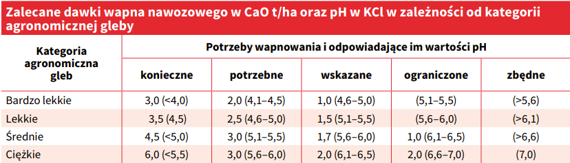 Zaleca się, aby stosować regularnie w praktyce rolniczej mniejsze dawki wapna, ale częściej. W pierwszej kolejności chodzi o podwyższenie pH gleby do optymalnej wartości, a następnie o jego utrzymanie. Prawidłowo wyliczona dawka wapna powinna zatem doprowadzić kwaśną glebę do wyższego zakresu pH zgodnie z kategorią agronomiczną gleby. Zalecane dawki wapna w zależności od kategorii agronomicznej gleby zamieszczono w tabeli.