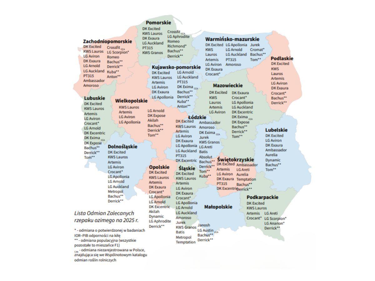 Obecnie w Krajowym rejestrze znajduje się 165 odmian rzepaku ozimego (32 populacyjne i 133 mieszańcowe). Ponad połowę zarejestrowanych odmian stanowią nowe, wpisane do rejestru w ostatnich pięciu latach. W ubiegłym roku do Krajowego rejestru wpisano 21 nowych odmian rzepaku ozimego, w tym dziewiętnaście mieszańcowych. W tym roku zarejestrowano kolejnych 19 nowych odmian rzepaku ozimego, 17 mieszańcowych: Crusador, DK Exarho, DK Plener, KWS Ditos, KWS Oceanos, LG Adamant, LG Adventus, LG Akerman, LG Arrakis, LID Cabero, LID Hello, LID Maestro, LID Tebo, Royce, SY Elisabetta, Tartu, Teflon oraz dwie populacyjne – Dreamline i Zodiak.