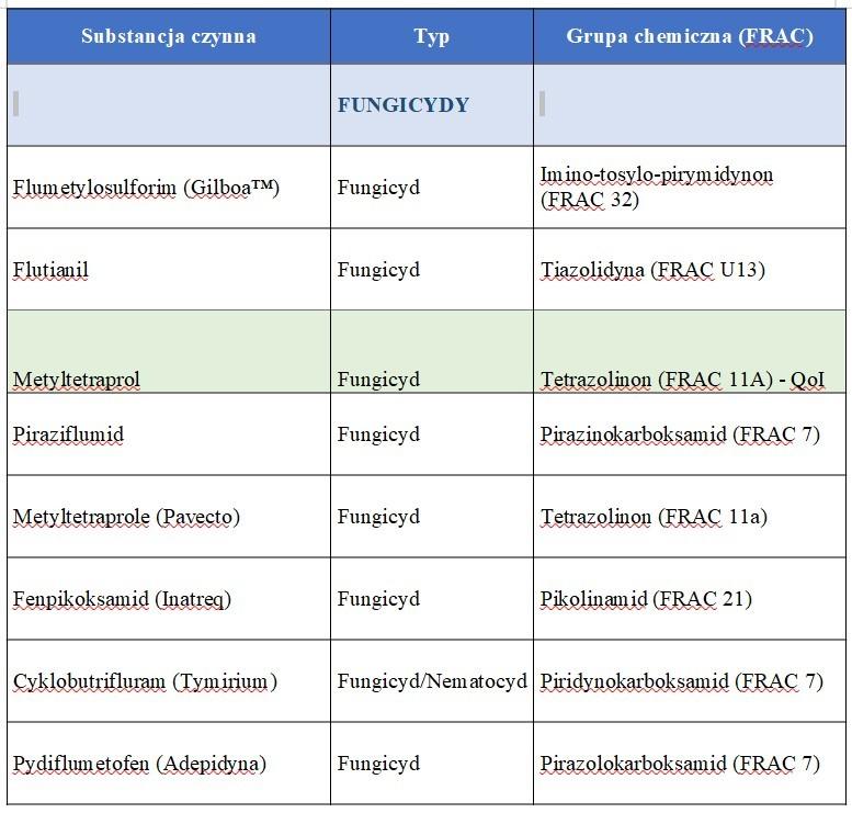 Przykładem takiej s.cz. jest zarejestrowany w ostatnich latach mefentriflukonazol z grupy triazoli oraz fenpikoksamid z grupy pikolinamidy. Charakterystykę ostatniej – najnowszej s.cz. grzybobójczej oraz zakres zwalczanych chorób zestawiono w tabelach 2 i 3. Substancje czynne o których mowa są dalej rozwijane i powstają w połączeniu z innymi s.cz. nowe fungicydy, czasami o jeszcze szerszym zakresie zwalczanych sprawców chorób.