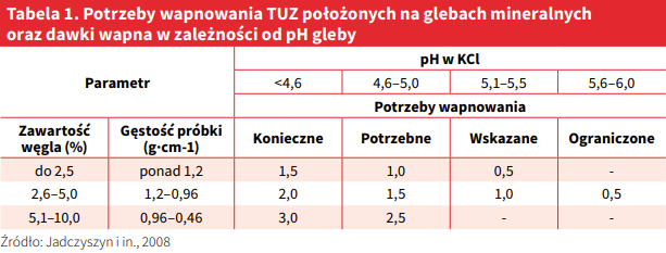 Potrzeby wapnowania TUZ (zgodnie ze starymi zasadami wapnowania) położonych na glebach mineralnych oraz wielkości dawek wapna w zależności od pH i kategorii agronomicznej gleby przedstawiono w tabeli 1.