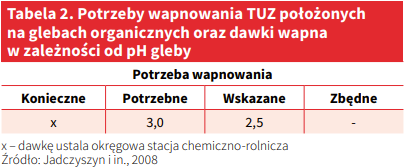 Natomiast potrzeby wapnowania TUZ położonych na glebach organicznych oraz zalecenia dawek nawozów wapniowych na glebach organicznych zamieszczono w tabeli 2. Wartość pH, przy której zastosowanie wapna nie powodowało wzrostu plonu przyjęto jako wartość krytyczną, dla której wapnowanie określa się jako zbędne.