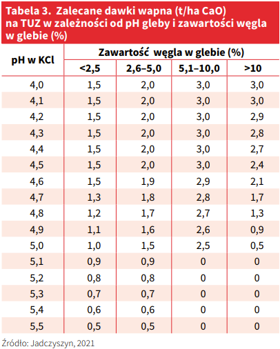 W nowych zaleceniach dotyczących wapnowania użytków zielonych wyeliminowano potrzeby wapnowania i oparto je wyłącznie na odczynie i zawartości węgla w glebie. Ideą nowych zaleceń jest pokazanie rolnikowi, że jednorazowe zastosowanie zabiegu wapnowania nie zapobiega zakwaszeniu gleb i należy wapnować je w sposób ciągły, zmniejszając jedynie dawki wraz ze wzrostem pH gleby (tabela 3), aż do uzyskania optymalnego odczynu.