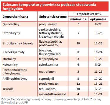 W etykietach środków często brakuje informacji o optymalnej temperaturze skutecznego działania produktu, a to bardzo istotne przy wyborze fungicydów na pierwsze zabiegi wiosną. Optymalnym zakresem skutecznego działania większości fungicydów jest przedział od 12 do 20°C, ale te właściwości substancji czynnych może znacznie poprawić formulacja i inne substancje pomocnicze będące w składzie preparatu.