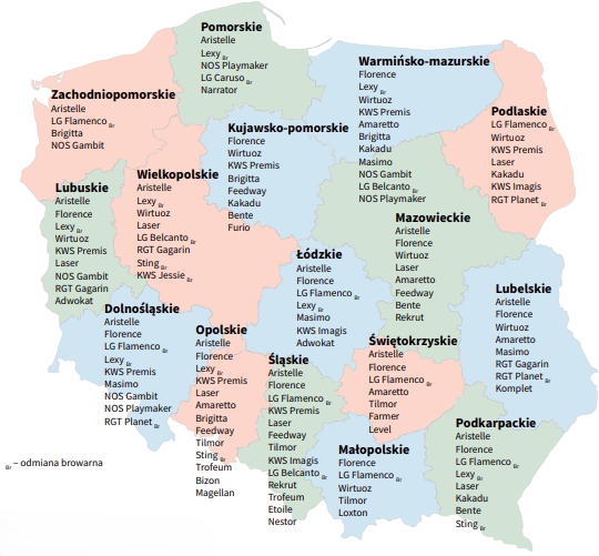 Najczęściej rekomendowane są 2 odmiany: Aristelle (jedna z najnowszych, wpisana do Krajowego rejestru w 2024 r.) i Florence. Obie są rekomendowana do uprawy w 12 województwach. To świadczy o ich stabilnym plonowaniu w całym kraju, w różnych warunkach glebowych. Godne uwagi są oczywiście wszystkie odmiany, ale im więcej województw je rekomenduje, tym stabilniej plonują w latach. Obok wspomnianych liderek LOZ jęczmienia jarego w kolejności za nimi są: LG Flamenco, Lexy, Wirtuoz, KWS Premis i Laser.