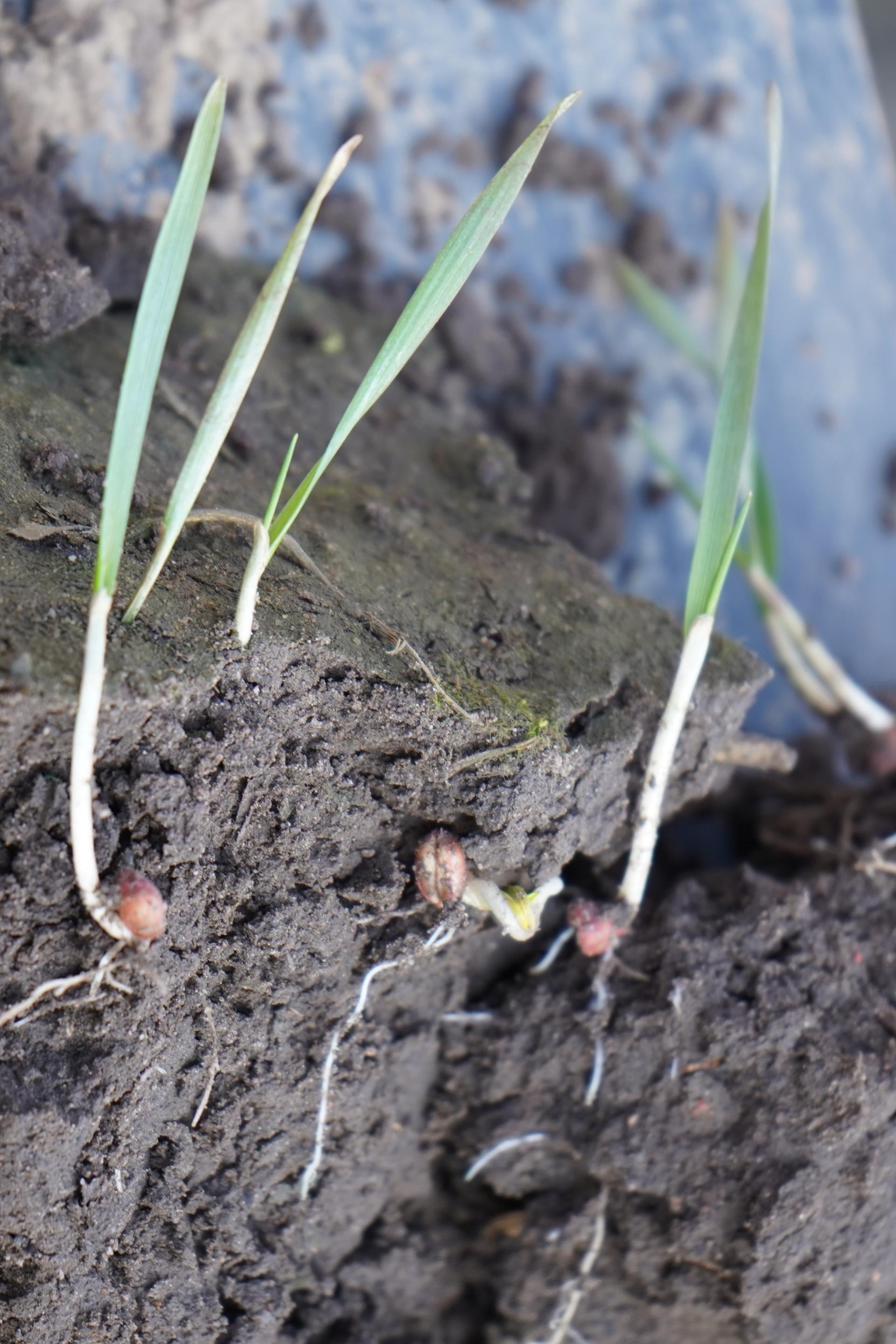 W obrębie doświadczeń zaprawowych obserwowano również żyto hybrydowe. To gatunek, który tradycyjnie uchodzi za zboże o najdalej sięgającym i najsilniej rozwiniętym systemie korzeniowym. Tak jest i w tym sezonie – nowe przyrosty korzeni w życie są jednymi z najbardziej okazałych. W Pamiątkowie żyto sieje się zwykle w terminie zbliżonym do pszenicy, głównie ze względów organizacyjnych, aby zoptymalizować wykorzystanie sprzętu.