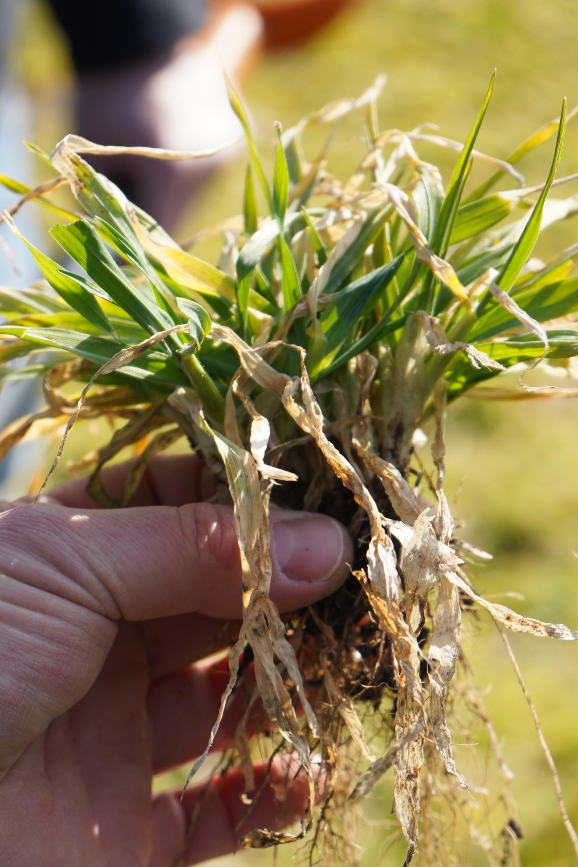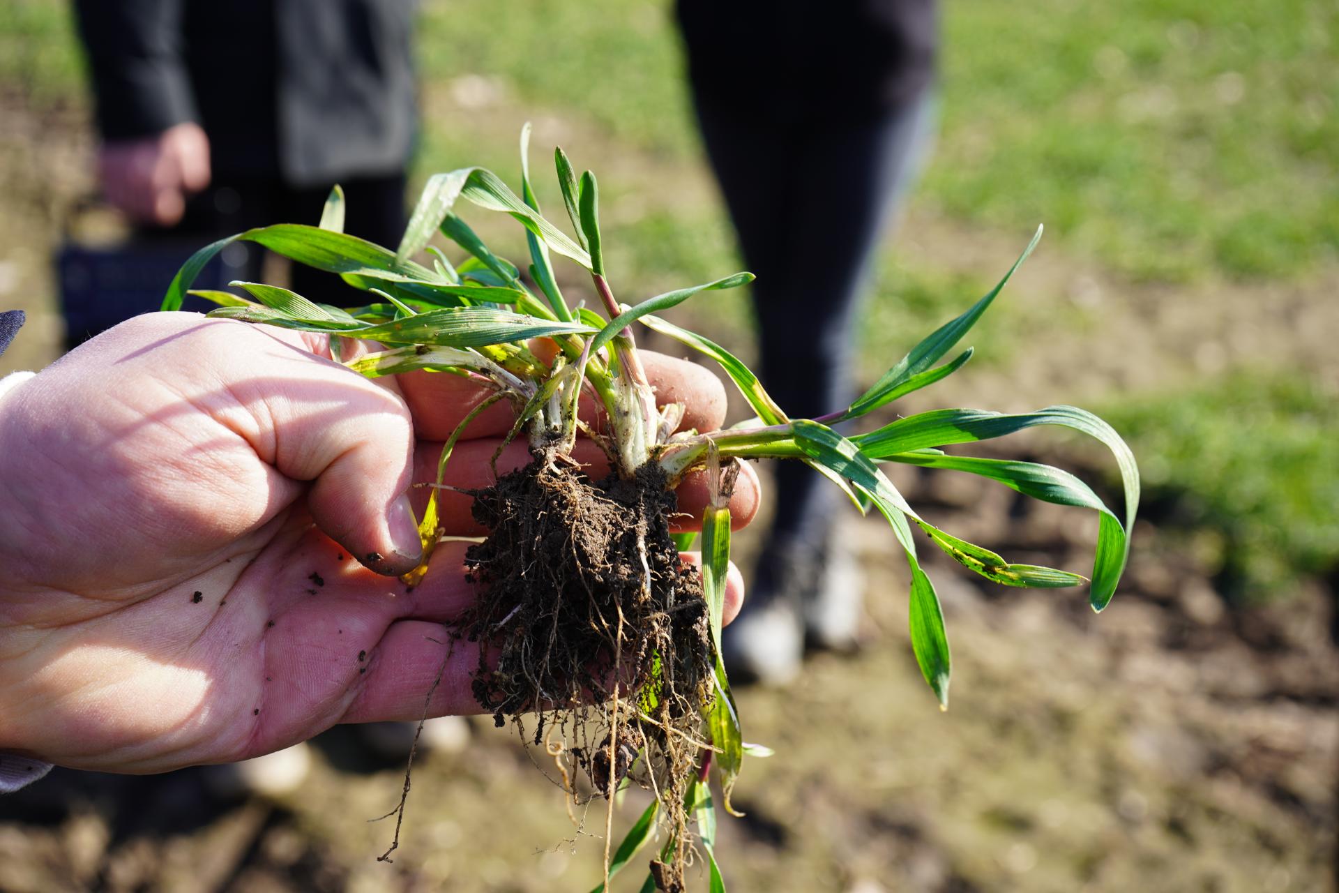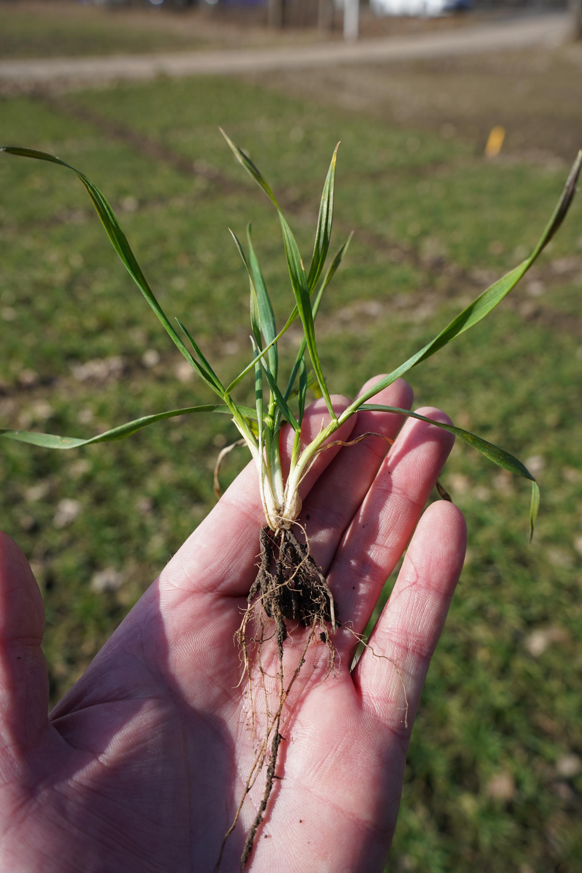 Ciekawy wniosek płynie np. z fragmentu pola, na którym wysiano pszenicę ozimą dopiero po Wszystkich Świętych, w pierwszej dekadzie listopada. Było to stanowisko po kukurydzy, gdzie długo było zbyt mokro. Rośliny 9 marca były w fazie około BBCH 11–12 – niewielkie, ale z wyraźnie widocznymi nowymi przyrostami korzeni. Taki obraz pokazuje, że pszenica żyje i wchodzi w fazę aktywnej regeneracji. W praktyce wielu rolników zauważyło, że właśnie późno siania pszenica przezimowała lepiej niż ta wysiana po terminie, ale wcześniej. Wynika to z faktu, że mała roślina przez długi czas korzysta z zasobów zgromadzonych w ziarniaku. Najbardziej newralgiczny moment to przejście z odżywiania z ziarniaka na pełne żywienie z systemu korzeniowego (faza 3 liści). Wtedy roślina jest najbardziej wrażliwa na wymarzanie.